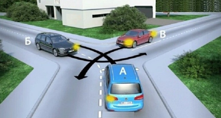 В данном случае ответ будет один, водители сами должны решить кто проедет первым, если уступает дорогу автомобиль А, то первым проедет автомобиль Б, потом В. Если уступает дорогу автомобиль Б, то соответственно проедет первым В потом А.