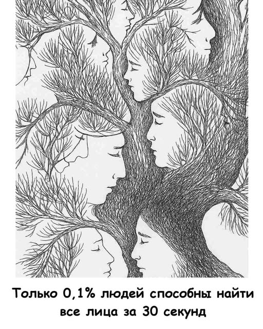 В этой иллюзии спрятано несколько лиц, которые нужно найти. Присмотритесь внимательнее — и вы увидите влюблённых, прижавшихся к стволу, старейшин, наблюдающих с ветвей, и детей, играющих у корней. Ни одно из этих лиц не бросается в глаза сразу — они проявляются постепенно, принося удовольствие тем, кто смотрит внимательно и терпеливо.